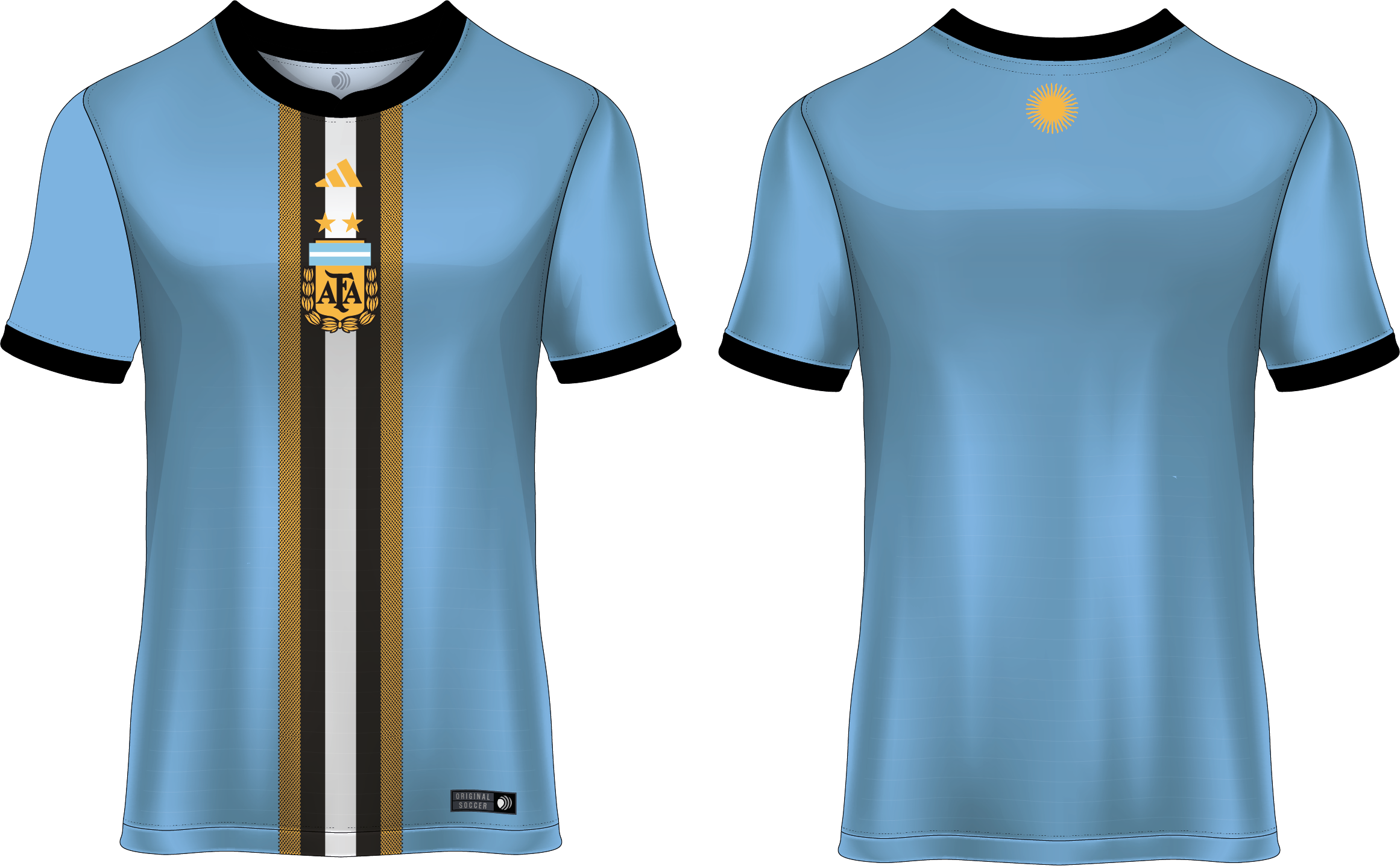 El diseño vectorial deportivo de la Selección de Argentina emana una poderosa amalgama de colores que encarna la esencia del fútbol argentino. El distintivo celeste, impregnado de un sentido de unidad y pasión, se entrelaza magistralmente con tonalidades negras que simbolizan la tenacidad y determinación del equipo. El toque dorado, sutil pero impactante, añade un brillo de grandeza y éxito. Este diseño, más que una representación gráfica, es un emblema de la fuerza inquebrantable y la gloria futbolística que la Selección Argentina lleva consigo, prometiendo una conexión visual imponente y duradera con los aficionados.